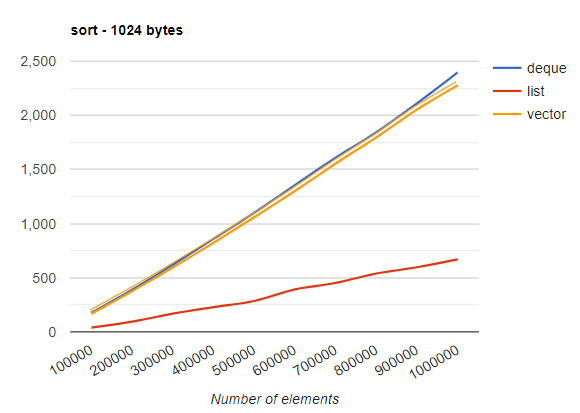 큰 용량 1024bytes 원소에서는 list가 다른 두 컨테이너보다 성능이 좋았음
