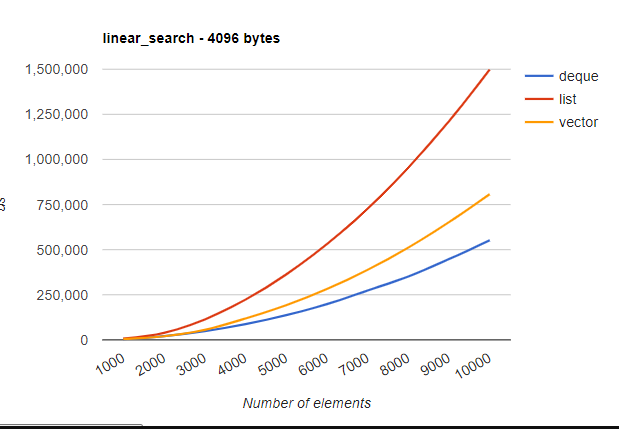 Linear search 결과 또한 list가 성능이 안좋았으며 deque와 vector는 성능이 비슷했음