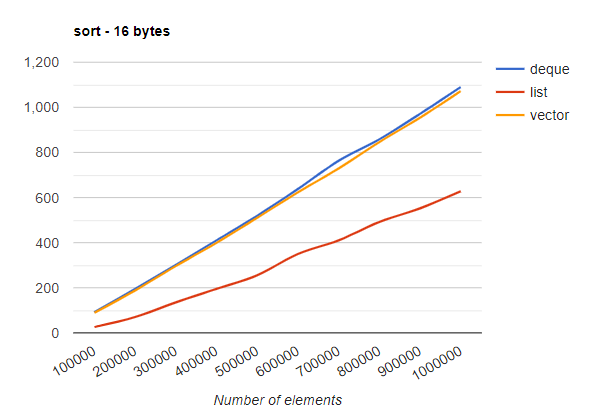 큰 용량 1024bytes 원소에서는 list가 다른 두 컨테이너보다 성능이 좋았음