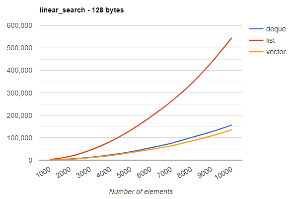 일부 결과에서 list가 deque와 vector보다 성능이 낮게 나오지만 이는 Linear search로 인한 것임